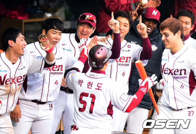 8일 오후 서울 목동야구장에서 열린 '2014 한국야쿠르트 세븐 프로야구 포스트시즌' 넥센 히어로즈와 삼성 라이온즈의 한국시리즈 4차전, 8회말 1사에서 대타로 나선 넥센 박헌도가 솔로포를 날리고 동료선수들과 기뻐하고 있다.