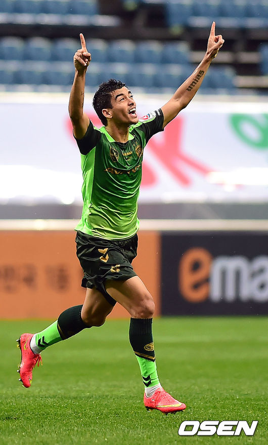 전반 전북 레오나르도가 선취골을 넣은 뒤 기뻐하고 있다.