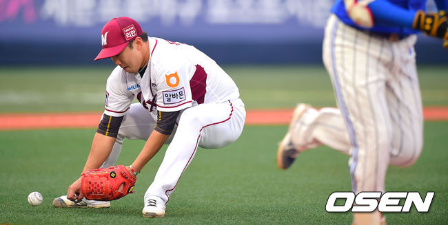 8일 오후 서울 목동야구장에서 열린 '2014 한국야쿠르트 세븐 프로야구 포스트시즌' 넥센 히어로즈와 삼성 라이온즈의 한국시리즈 4차전,9회초 무사 1,2루 삼성 채태인의 내야땅볼을 넥센 문성현 투수가 실책으로 놓치고 있다.