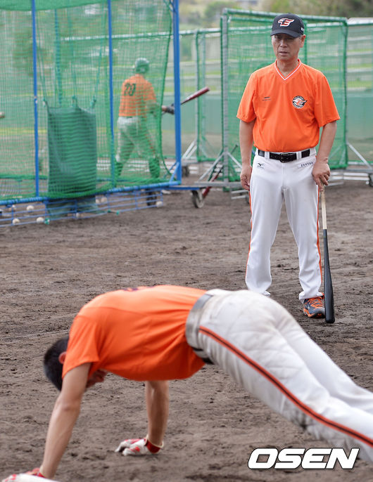 8일 오전 일본 오키나와 고친다 구장에서 한화 이글스 2014 마무리 캠프가 진행됐다. 김성근 감독이 타격 훈련 중 푸쉬업을 시키고 있다.