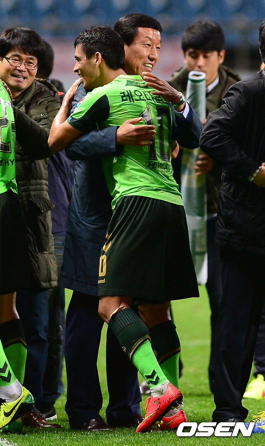 K리그 클래식 우승을 거둔 전북 현대 최강희 감독이 레오나르도와 기뻐하고 있다./ youngrae@osen.co.kr