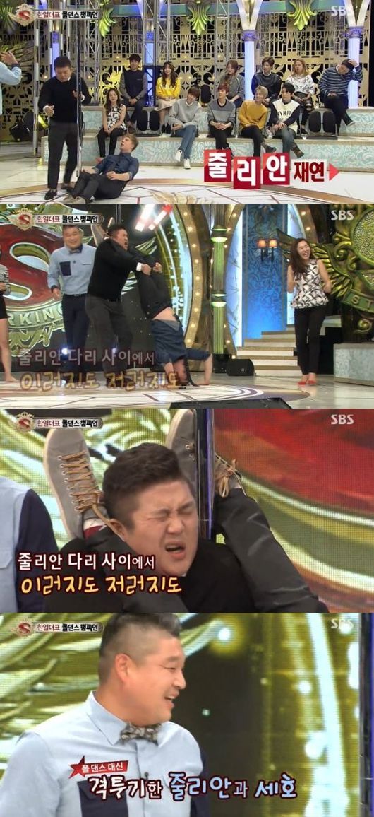 그러나 폴 댄스는 쉽지 않았다. 일단 물구나무 서기 자세를 하던 줄리안을 도와주려던 조세호가 다리 사이에 껴 이러지도 저러지도 못하게 된 것.