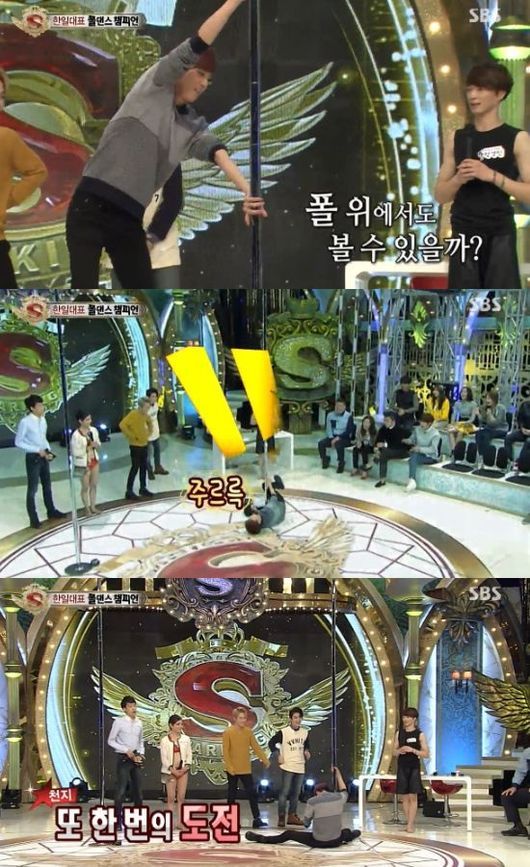 그러나 이는 쉽지 않았다. 평소 무대 위에서 카리스마를 발산하던 칼군무돌인 그는 폴을 잡자마자 바닥으로 주르륵 추락해버렸다.