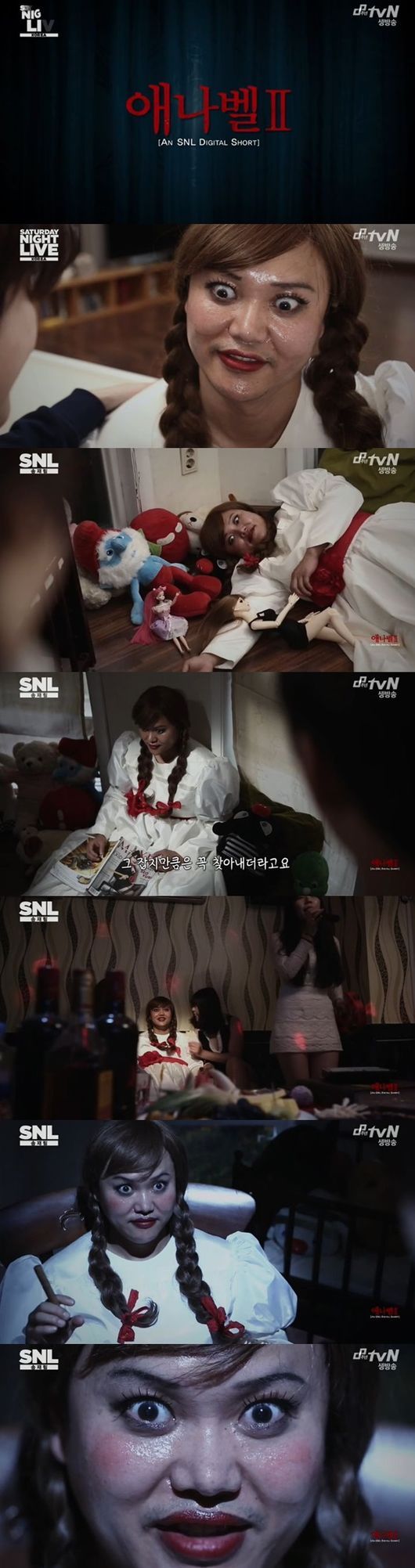 8일 오후 방송된 tvN 'SNL코리아'에서 크루인 김민교는 영화 공포영화 '애나벨'을 패러디한 예고편 형식의 콩트 '애나벨2'에서 인형 연기를 소화했다.