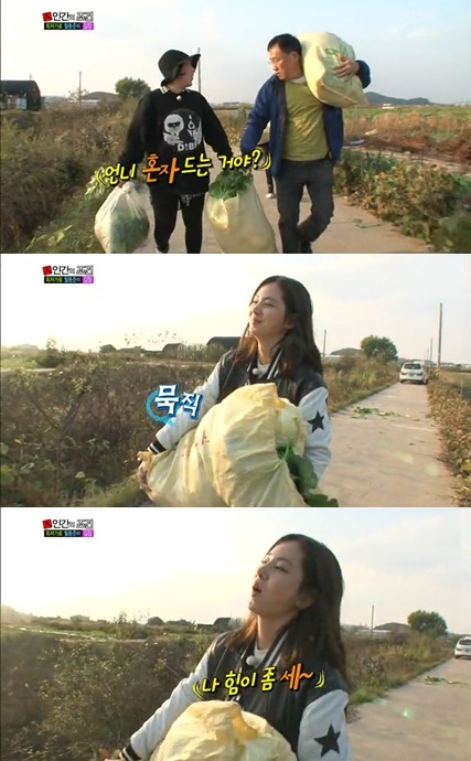 싼 가격으로 배추를 산 후 이들은 차까지 배추를 옮겨야 했다. 김영희는 함께 배추를 드는 것과 달리 한채아는 혼자 들고 옮기기 시작했다. 이에 김영희는 “언니 혼자 드는 거냐”고 물었고 한채아는 무거운 배추를 들고서도 전혀 힘들어하는 표정을 짓지 않고 “나 힘이 좀 세”라고 말해 웃음을 자아냈다.