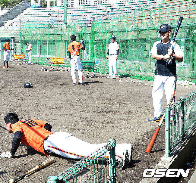 9일 오전 일본 오키나와 고친다 구장에서 한화 이글스 2014 마무리 캠프가 진행됐다. 김성근 감독 앞에서 김정수가 푸쉬업을 하고 있다.