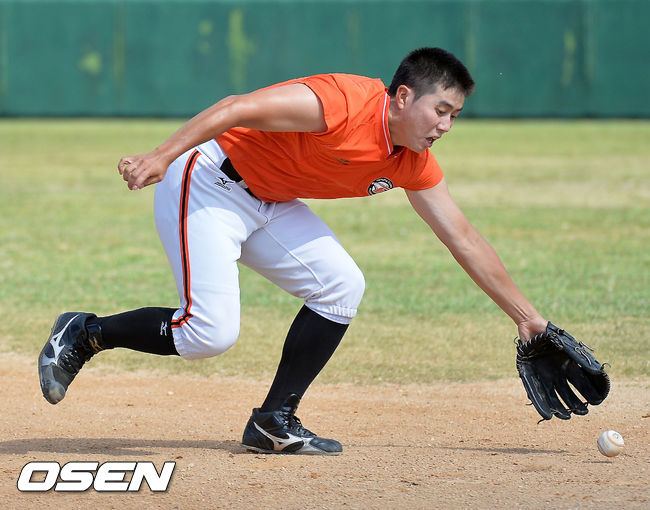 9일 오전 일본 오키나와 고친다 구장에서 한화 이글스 2014 마무리 캠프가 진행됐다. 허유강이 아메리칸 펑고 훈련을 하고 있다.