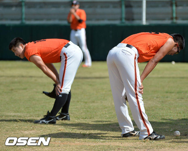 9일 오전 일본 오키나와 고친다 구장에서 한화 이글스 2014 마무리 캠프가 진행됐다. 허유강과 구본범이 아메리칸 펑고 훈련을 하며 숨을 고르고 있다.