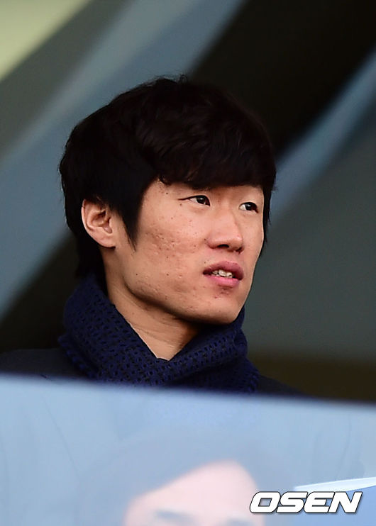 경기에 앞서 박지성이 관중석에서 그라운드를 바라보고 있다.