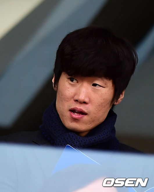 경기에 앞서 박지성이 관중석에서 그라운드를 바라보고 있다.