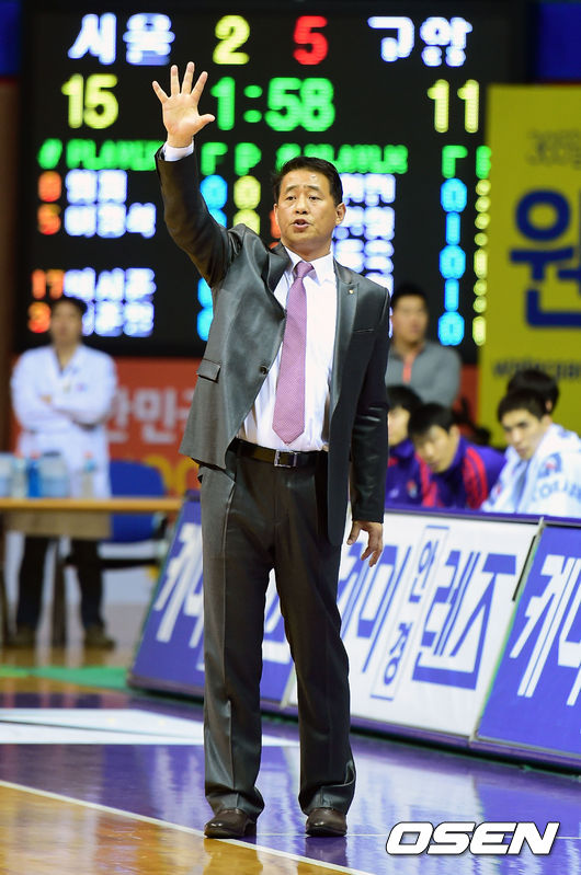 1쿼터 오리온스 추일승 감독이 선수들에게 작전을 지시하고 있다.