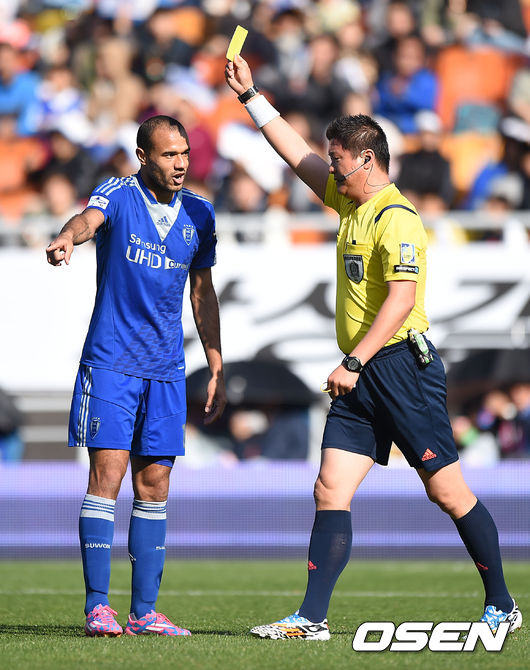 전반 수원 로저가 반칙 판정에 흥분하고 있다.