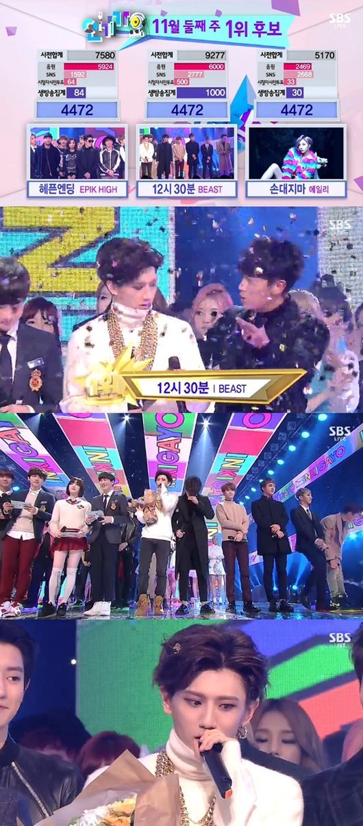 인기그룹 비스트가 9일 SBS '인기가요'에서 1위를 차지했다.