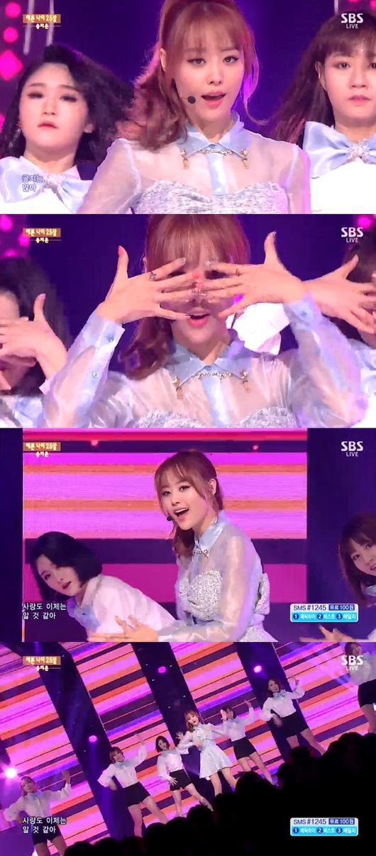 송지은은 9일 오후 방송된 SBS '인기가요'에 출연해 '예쁜 나이 25살'의 무대를 꾸몄다.