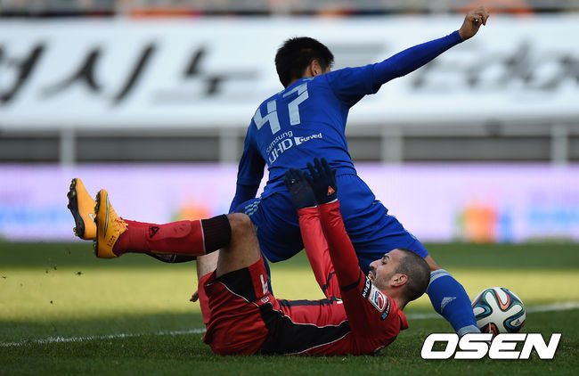 후반 서울 에스쿠데로가 수원 문전에서 오범석과 충돌하며 파울이 아니냐며 어필하고 있다.
