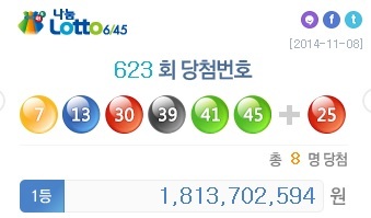 로또 623회 당첨번호, 1등 8명 1인당 18억 1370만 원