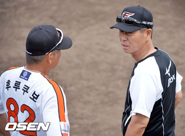 9일 오전 일본 오키나와 고친다 구장에서 한화 이글스 2014 마무리 캠프가 진행됐다. 김성근 감독이 후루쿠보 코치와 얘기를 나누고 있다.