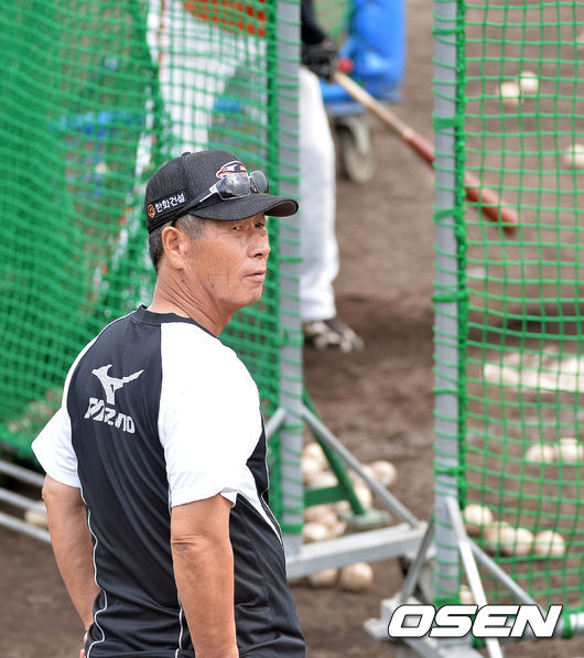 9일 오전 일본 오키나와 고친다 구장에서 한화 이글스 2014 마무리 캠프가 진행됐다. 김성근 감독이 타격훈련을 지켜보며 여러 곳을 둘러보고 있다.