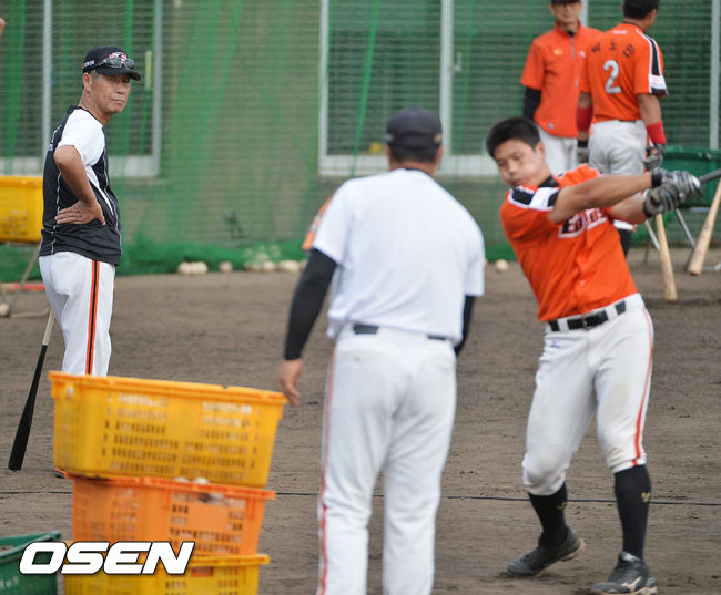 9일 오전 일본 오키나와 고친다 구장에서 한화 이글스 2014 마무리 캠프가 진행됐다. 김성근 감독이 정범모의 타격훈련을 체크하고 있다.