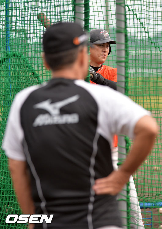 9일 일본 오키나와 고친다 구장에서 한화 이글스 2014 마무리 캠프가 진행됐다. 김회성이 타격 연습을 할때 김성근 감독이 지켜보고 있다.