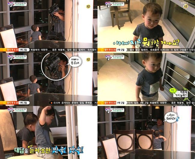 이날 방송에서 민국은 평소에는 가려져 있던 곳에 VJ가 카메라를 들고 있자 "아저씨 지금 뭐하세요?"라고 물어 VJ를 당황케 했다.