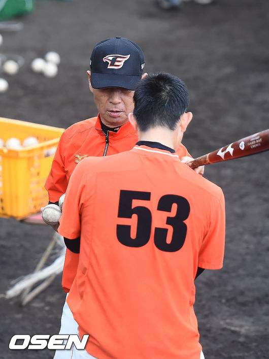 9일 일본 오키나와 고친다 구장에서 한화 이글스 2014 마무리 캠프가 진행됐다. 배팅볼을 던져주던 김성근 감독이 김회성에게 타격 폼을 알려주고 있다.