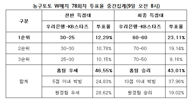 최종 우리은행 60점대-KB스타즈 60점대 23.11%로 최다 집계…10일 오후 6시 50분 마감