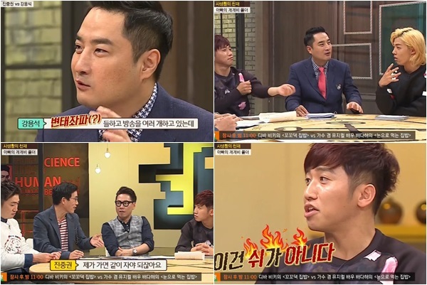 이날 방송에서는 '진중권 잡는' 장동민의 활약이 빛났다. 그는 대학교 연구 결과 등을 인용하는 진중권의 말이 시작되기가 무섭게 "딴 나라 애기 좀 그만해", "말만하면 19세기야"라며 구박해 웃음을 자아냈다.