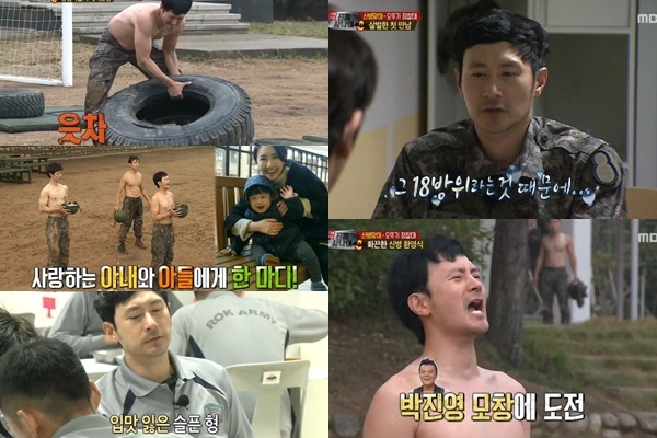 게다가 체력적으로도 많은 한계를 보여 짠함을 더욱 높였다. 그는 장병들의 체력 훈련을 위해 거대한 고무바퀴를 지탱하는 임무를 맡았다. 그러나 이내 장병들의 힘에 의해 바퀴가 넘어졌고, 이를 제대로 들지 못하며 낑낑대는 모습으로 또 한 번 웃음을 안겼다. 이 장면에서 역시 슬픈 배경 음악은 빠지지 않았다.