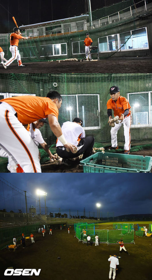 백미는 오후 4시였다. 고참 3인방 조인성·김태균·정근우가 마지막 훈련조에 포함돼 고친다구장에 온 것이다. 이들은 오후 6시20분까지 힘차게 배트를 돌렸다. 정근우는 마지막까지 김 감독에게 잡혀 토스 배팅을 했다. 어느덧 고친다구장의 해는 져있었다. 휴일에도 훈련으로 하루를 꼬박 채웠다.