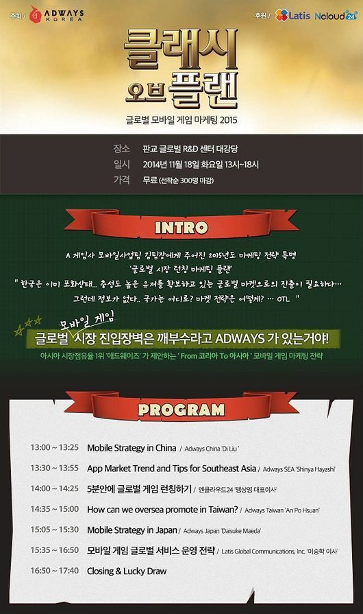 또한 최근 애드웨이즈코리아가 현지화 서비스 전문 기업 ‘라티스 글로벌’, 클라우드 컴퓨팅 서비스 기업 ‘엔클라우드24’와 함께 발표한 ‘LAN 서비스’의 자세한 설명을 위한 발표도 진행된다. LAN 서비스는 세 회사의 머리글자를 딴 것으로, 각 사의 강점을 적극 활용해 모바일 게임사들의 해외시장 진출을 지원하는 통합 마케팅 솔루션이다.