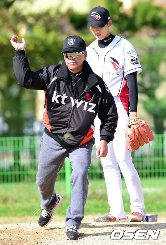 kt 조범현 감독이 투구폼을 선보이고 있다.
