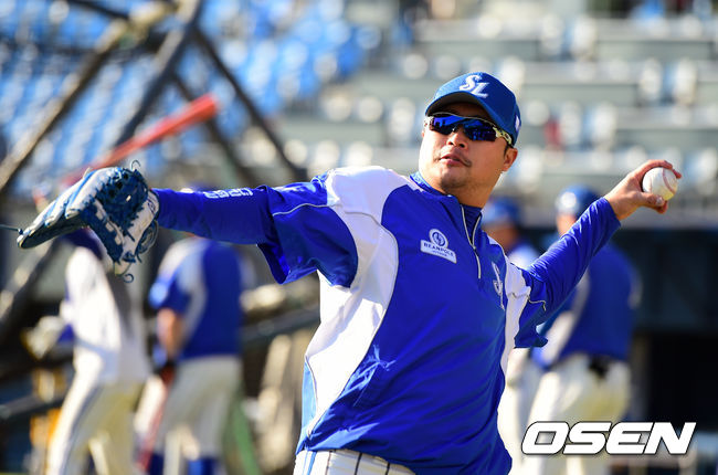 10일 오후 서울 잠실야구장에서 열린 '2014 한국야쿠르트 세븐 프로야구 포스트시즌' 삼성 라이온즈와 넥센 히어로즈의 한국시리즈 5차전, 경기에 앞서 삼성 박한이가 캐치볼로 몸을 풀고 있다.