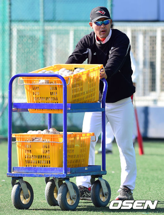 kt 이숭용 코치가 타격훈련을 위해 볼 박스를 옮기고 있다.