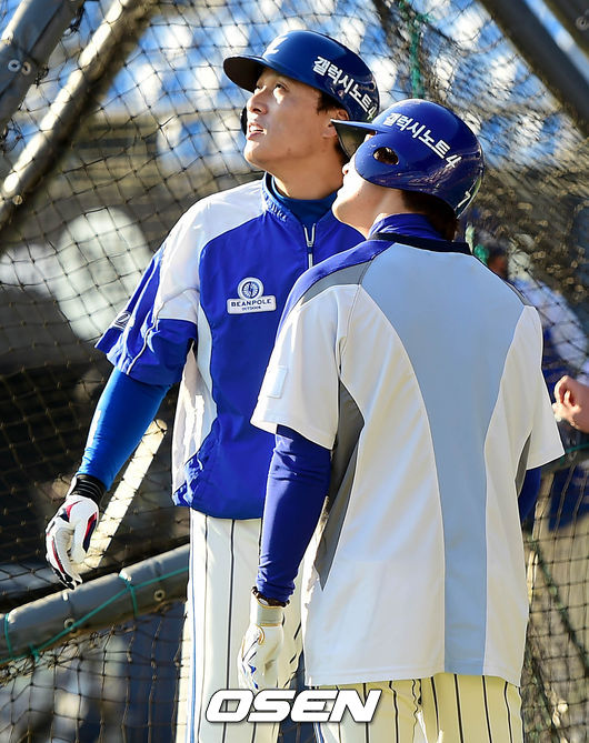 10일 오후 서울 잠실야구장에서 열리는 '2014 한국야쿠르트 세븐 프로야구 포스트시즌' 삼성 라이온즈와 넥센 히어로즈의 한국시리즈 5차전, 경기에 앞서 삼성 이승엽과 김상수가 연습 중 타구를 바라보고 있다.