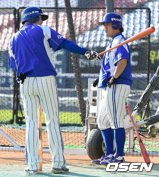 10일 오후 서울 잠실야구장에서 열리는 '2014 한국야쿠르트 세븐 프로야구 포스트시즌' 삼성 라이온즈와 넥센 히어로즈의 한국시리즈 5차전, 경기에 앞서 삼성 이승엽과 박석민이 타격 훈련 중 대화를 나누고 있다.