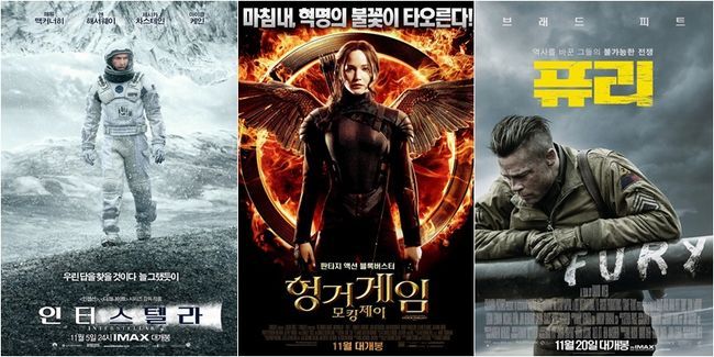 놀란 감독의 영화 '인터스텔라'가 지난 6일 개봉 이후 놀라운 속도로 흥행 돌풍을 일으키고 있는 가운데 오는 20일 제니퍼 로렌스 주연 '헝거게임:모킹제이(이하 '헝거게임3')'와 브래드 피트 주연 '퓨리'까지 할리우드 대작들이 연이어 개봉을 앞두고 있어 한국 영화의 흥행 전망을 흐리게 하고 있다.