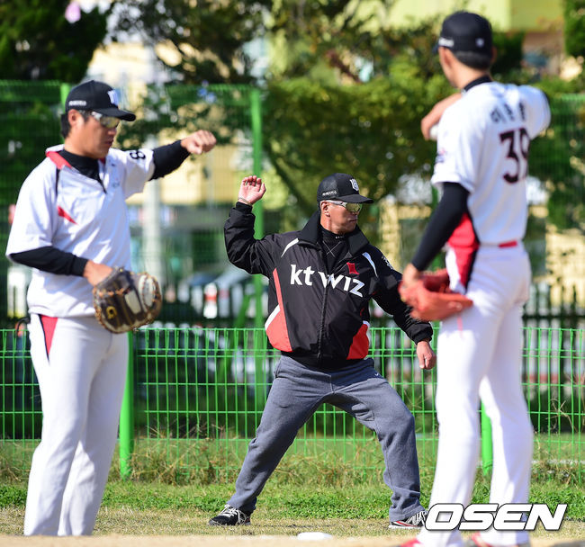 kt 조범현 감독이 투구폼을 선보이고 있다.