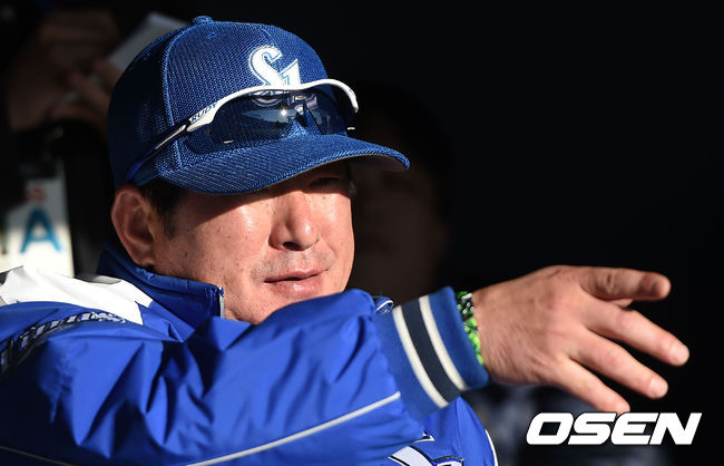 10일 오후 서울 잠실야구장에서 열린 '2014 한국야쿠르트 세븐 프로야구 포스트시즌' 삼성 라이온즈와 넥센 히어로즈의 한국시리즈 5차전, 경기에 앞서 삼성 류중일 감독이 취재진과 이야기를 나누고 있다.