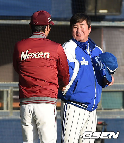 10일 오후 서울 잠실야구장에서 열린 '2014 한국야쿠르트 세븐 프로야구 포스트시즌' 삼성 라이온즈와 넥센 히어로즈의 한국시리즈 5차전, 경기에 앞서 삼성 류중일 감독과 넥센 염경엽 감독이 인사를 나누고 있다.
