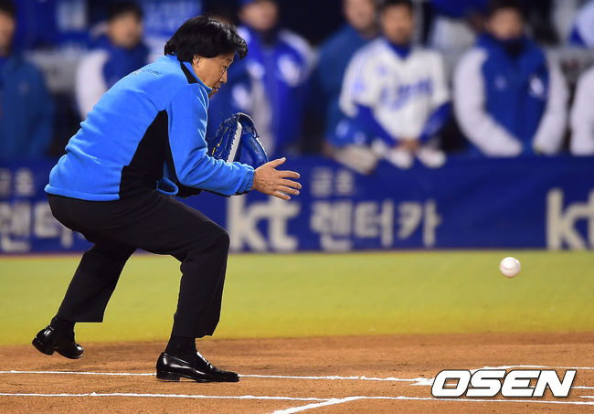 10일 오후 서울 잠실야구장에서 열린 '2014 한국야쿠르트 세븐 프로야구 포스트시즌' 삼성 라이온즈와 넥센 히어로즈의 한국시리즈 5차전, 경기에 앞서 어우홍 야구 로와 김재박 KBO 경기운영위원이 시구, 시포를 하고 있다.