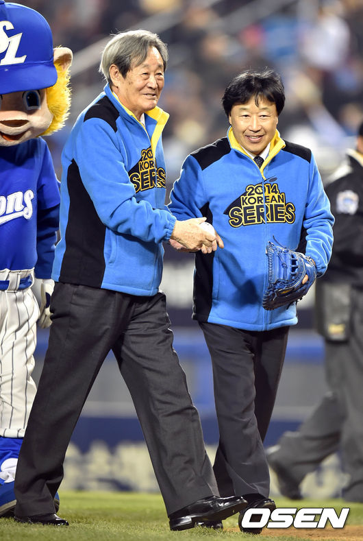 10일 오후 서울 잠실야구장에서 열린 '2014 한국야쿠르트 세븐 프로야구 포스트시즌' 삼성 라이온즈와 넥센 히어로즈의 한국시리즈 5차전, 시구와 포구를 한 야구원로 어우홍 김재박이 야구장을 빠져나가고 있다.