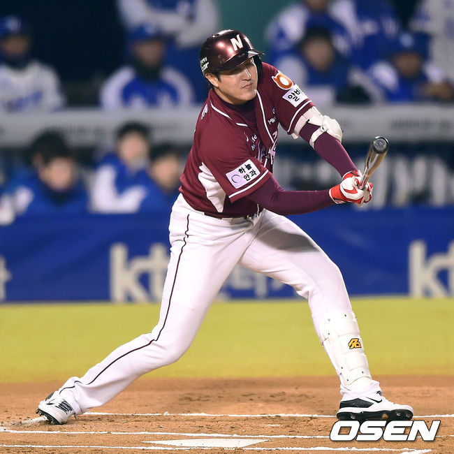 10일 오후 서울 잠실야구장에서 열린 '2014 한국야쿠르트 세븐 프로야구 포스트시즌' 삼성 라이온즈와 넥센 히어로즈의 한국시리즈 5차전,1회초 2사 넥센 유한준이 헛스윙을 하고 있다