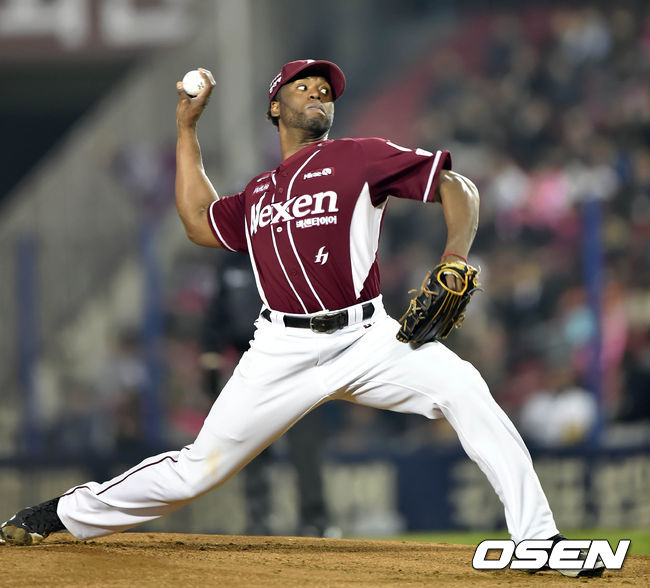 10일 오후 서울 잠실야구장에서 열린 '2014 한국야쿠르트 세븐 프로야구 포스트시즌' 삼성 라이온즈와 넥센 히어로즈의 한국시리즈 5차전,1회말 넥센 선발 소사가 힘차게 공을 던지고 있다.