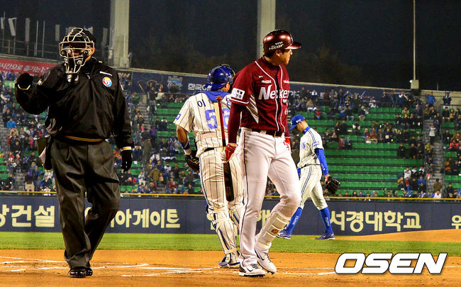 10일 오후 서울 잠실야구장에서 열린 '2014 한국야쿠르트 세븐 프로야구 포스트시즌' 삼성 라이온즈와 넥센 히어로즈의 한국시리즈 5차전, 1회초 2사에서 넥센 유한준이 삼진으로 물러나고 있다.