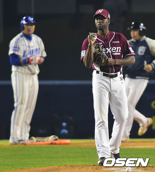 1회말 삼성 공격 1사 주자없는 상황 박한이에게 볼넷을 내준 넥센 선발 소사가 동료들에게 사인을 보내고 있다.