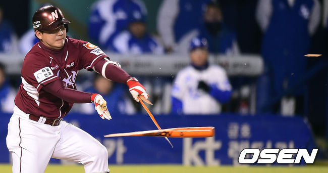 10일 오후 서울 잠실야구장에서 열린 '2014 한국야쿠르트 세븐 프로야구 포스트시즌' 삼성 라이온즈와 넥센 히어로즈의 한국시리즈 5차전, 2회초 2사 넥센 김민성이 내야안타를 날리고 있다.