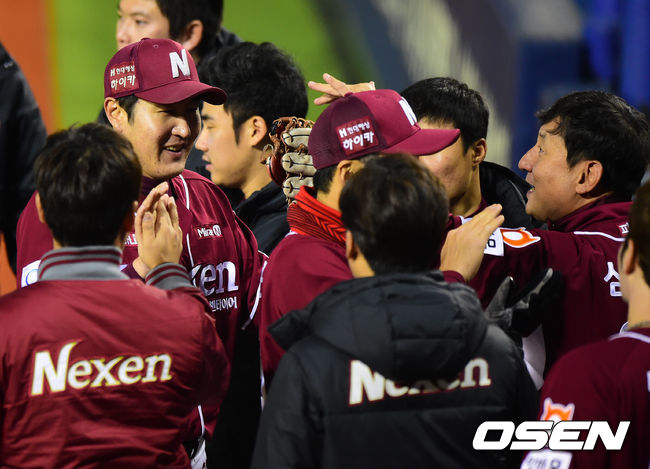 10일 오후 서울 잠실야구장에서 열린 '2014 한국야쿠르트 세븐 프로야구 포스트시즌' 삼성 라이온즈와 넥센 히어로즈의 한국시리즈 5차전, 2회말 2사 1,2루에서 삼성 나바로의 타구를 넥센 유한준이 잡아내고 더그아웃으로 향하며 동료선수들과 하이파이브를 하고 있다.