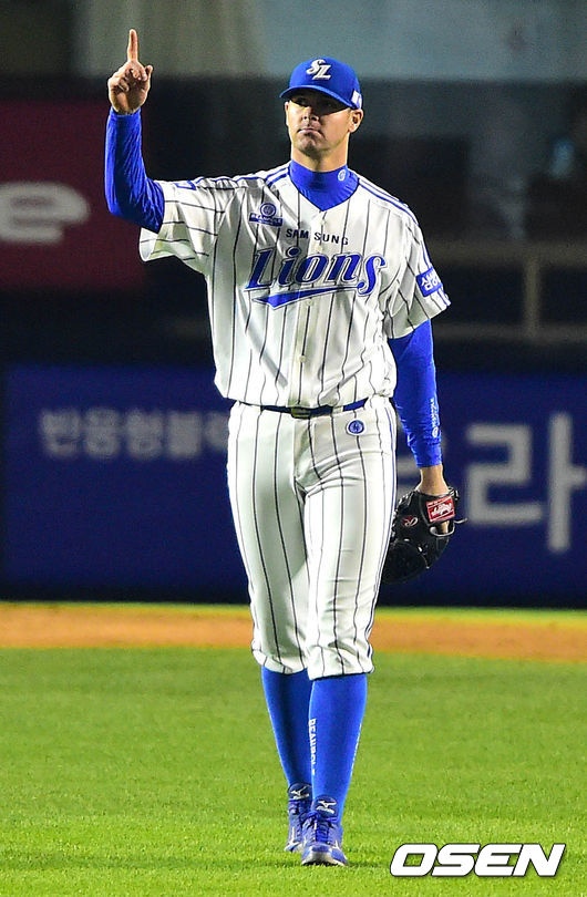 3회초 넥센 공격 선두타자로 나선 박헌도의 타구가 삼성 우익수 박한이의 호수비로 잡히자 삼성 선발 밴덴헐크가 기뻐하고 있다.