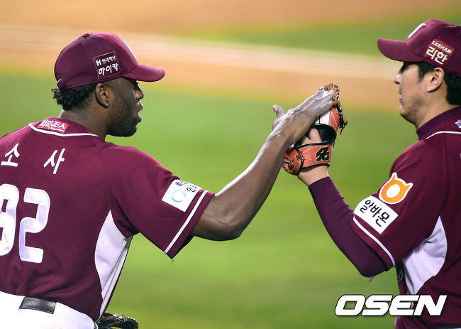 10일 오후 서울 잠실야구장에서 열린 '2014 한국야쿠르트 세븐 프로야구 포스트시즌' 삼성 라이온즈와 넥센 히어로즈의 한국시리즈 5차전, 2회말 2사 1,2루 삼성 나바로의 안타성 타구를 잡은 유한준이 소사의 축하를 받으며 더그아웃으로 들어가고 있다.